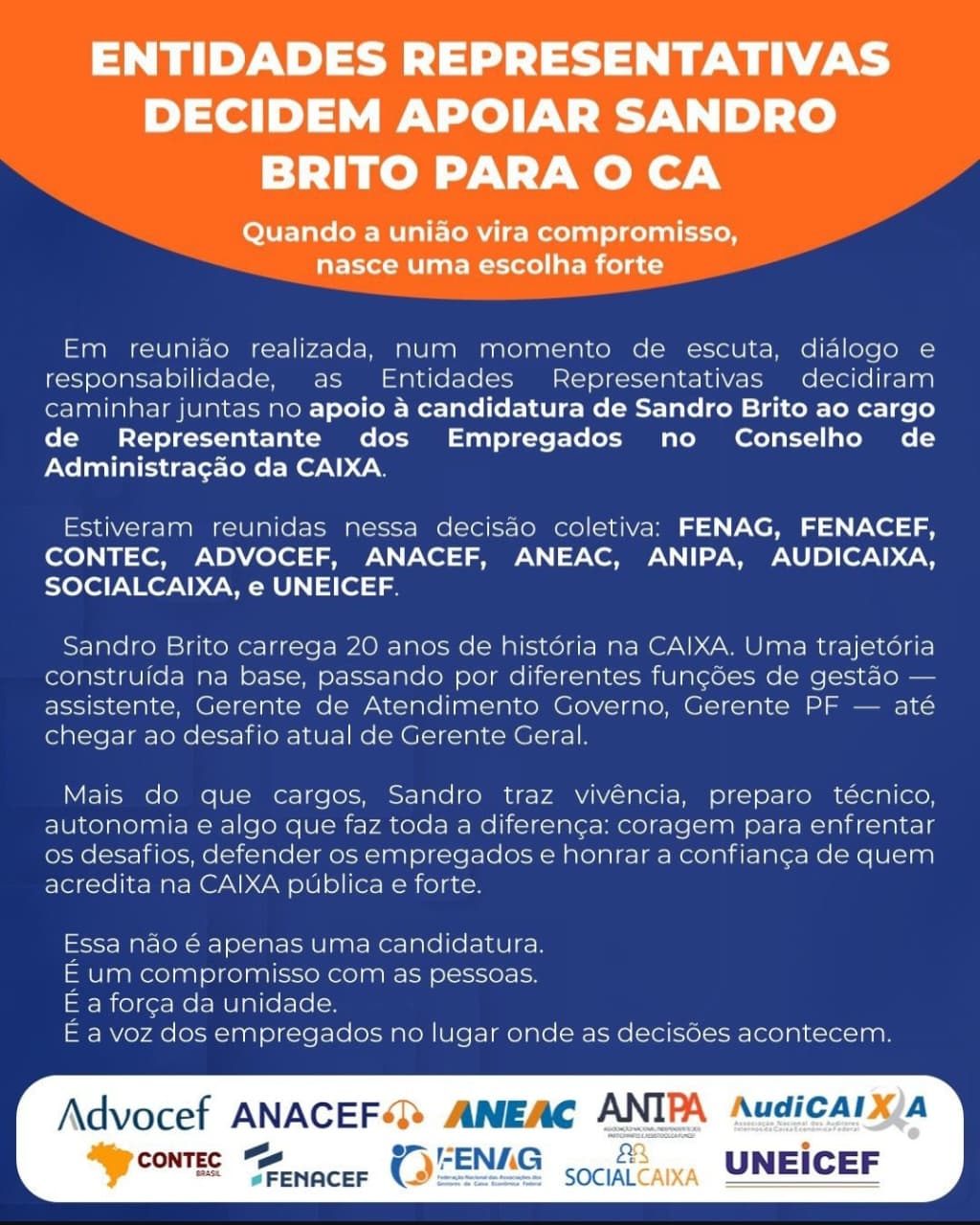 Estiveram reunidas nessa decisão coletiva: FENAG, FENACEF, CONTEC, ADVOCEF, ANACEF, ANEAC, ANIPA, AUDICAIXA, SOCIALCAIXA, e UNEICEF.Sandro Brito carrega 20 anos de história na CAIXA. Uma trajetória construída na base, passando por diferentes funções de gestão — assistente, Gerente de Atendimento Governo, Gerente PF — até chegar ao desafio atual de Gerente Geral.
