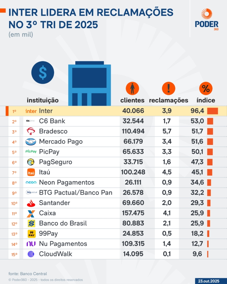 Instituições financeiras concentram queixas sobre crédito consignado, cartões e falhas de atendimento, segundo levantamento divulgado nesta 5ª feira (23.out.2025) pelo BC (Por Simone Kafruni e Hamilton Ferrari)Os bancos Inter, C6 e Bradesco lideram o ranking de reclamações do 3º trimestre. O levantamento foi divulgado nesta 5ª feira (23.out.2025) pelo Banco Central. Proporcionalmente ao número de clientes, o Inter tem índice de reclamações quase duas vezes maior que o do 2º colocado, além de figurar no pódio desde 2023.